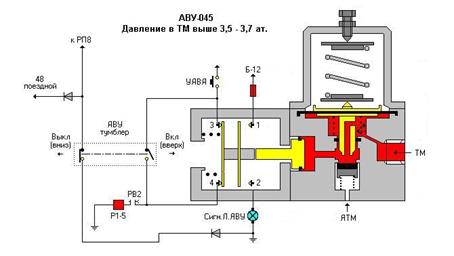 Как известно пневматический тормоз обладает так называемым «свойством мягкости», т.е. при утечке сжатого воздуха из тормозной магистрали темпом мягкости (0,3 – 0,5 ат/мин.), воздухораспределитель не осуществляет пневматического торможения. Это происходит потому, что при падении давления в магистральной камере в главной части ВР, одновременно давление падает в рабочей камере главной части ВР и в рабочей камере объемом 7 литров, так как воздух из них успевает свободно проходить через открытое, внешнее седло клапана зарядки и калиброванное отверстие d=0,8 мм. в верхней части зажима магистральной диафрагмы не вызывая разницы давления в рабочей и магистральных камерах главной части ВР. Так как такие утечки, при не своевременном обнаружении их машинистом весьма опасны, для контроля за подобными ситуациями, был разработан прибор безопасности АВУ-045. АВУ-045 предназначен для контроля за давлением в тормозной магистрали. При падении давления в тормозной магистрали ниже отметки в 2,7 – 2,9 ат., АВУ-045 размыкает свой контакт в цепи катушки Р1-5 (цепь управления) и включает ВЗ№1 на всех вагонах состава. АВУ-045 по конструкции относится к клапанно-диафрагменно-поршневым, электропневматическим приборам. АВУ-045 условно можно разделить на две части – пневматическую и электрическую (контактную). АВУ-045 установлен в кабине машиниста, перед УАВА. У машиниста, в предусмотренных случаях, есть возможность отключить АВУ-045 при помощи тумблера, который расположен на пульте и опломбирован. Устройство: