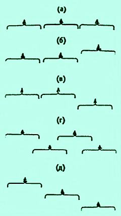(а) – в линию; (б) – уступом вперед; (в) – уступом назад; (г) – шахматный; (д) – ступенью.