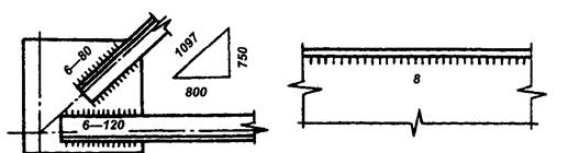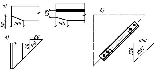 Вид сверху в проекционной связи–над главным видом, вид снизу–под главным видом, вид справа–справа от главного вида, вид слева–слева от главного вида. Над каждым видом, кроме главного, делают надпись по типу «А», а направление взгляда указывают стрелкой, обозначенной соответствующей буквой. Если нужно показать какую-то часть конструкции, то на главном виде или каком-нибудь другом виде направление взгляда можно показать как разрез или сечение (двумя разомкнутыми линиями со стрелками), а само изображение сопроводить надписью: 1-1 или 2-2 и т. п. При вычерчивании узлов металлических конструкций видимыми показывают те части, которые находятся в непосредственной близости от наблюдателя, а невидимыми – только те, которые расположены вплотную к видимым. Металлические конструкции из прокатных профилей могут изображаться на чертежах без скругления углов. Разрезы, сечения. Контуры элементов конструкций на изображениях разрезов и сечений не штрихуют. На чертежах, масштаб которых мельче 1:20, изображения сечения элементов конструкций допускается показывать одной линией. Отверстия, заклёпки и болты на видах и разрезах, параллельных их осям, можно изображать осевыми линиями. Скосы, уклоны. Скосы на чертежах элементов конструкций показывают линейными размерами (рис. 3.8 а) или с помощью прямоугольного треугольника, гипотенуза которого совпадает с краем изображения или выносной линией (рис. 3.8 б). Величина горизонтального и вертикального катетов представляет собой абсолютное или относительное значение их длины. Уклон элемента металлических конструкций (например, раскосы фермы), также обозначают треугольником, только располагают его в непосредственной близости от него или на продолжении осевой линии (рис. 3.8 в).