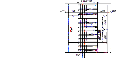 Высота одного марша будет равна Н / 2 = 3000 / 2 = 1500 мм. Число подступенков в одном марше n = 1500 / 15 = 10. Число проступей в одном марше будет на единицу меньше числа подступенков, так как верхняя проступь располагается на уровне площадки. Длина горизонтальной проекции марша (его залегание)