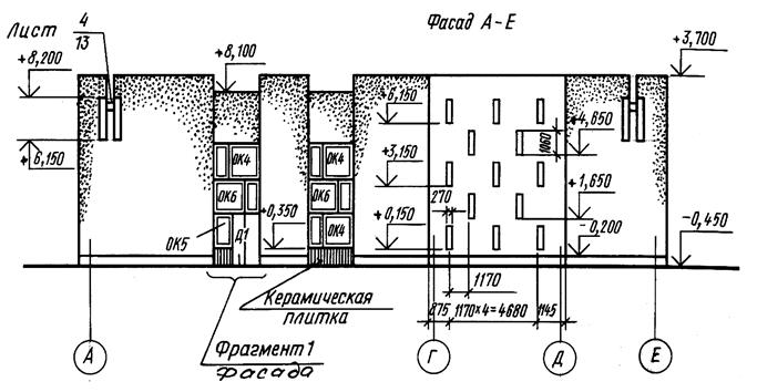 На чертежах фасадов желательно указывать диффамационные швы, пожарные лестницы, трубы наружного водостока, пандусы у ворот, жалюзийные решетки, в том числе установленные вместо оконных переплетов, и т.п. На фасадах показывают координационные оси, расположенные по краям фасада, у диффамационных швов, в местах уступов в плане и перепадов высот здания. Размеры на чертежах фасада не проставляются. На них указывают отметки уровня земли, верха стен, входных площадок и элементов фасадов, расположенных в разных уровнях. Чертеж фасада здания выполняется в следующей последовательности (рис. 26).