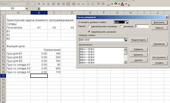 Тогда целевая функция будет иметь вид L = 2х11+ 5х12 + 2 х13 + 4 х21 + х22+ 5 х23 +3 х31 + 6 х32 + 8 х32 → min При ограничениях: x11+ х12 + x13 = 140 - груз, привезенный грузополучателю В1со всех складов x21+ х22 + x23 = 300 - груз привезенный, грузополучателю В2 со всех складов x31+ х32 + x33 = 160 - груз, привезенный грузополучателю ВЗ со всех складов x11+ х21 + x31= 90 - груз, отгруженный со склада А1 х12 + х22 + х32 = 400 - груз, отгруженный со склада А2 х13 + х23 + х33 = 90 - груз, отгруженный со склада АЗ х11≥0; х12≥0; х13≥0; х21≥0; х22≥0; х23≥0; х31≥0; х32≥0; х33≥0. Представим математическую модель на рабочем-листе в виде, изображенном на рисунок 1, записывая в ячейку В9 формулу функции цели, а в ячейки В11 - В16 формулы ограничений. В диалоговом окне Поиск решения в соответствующих полях установим адрес целевой ячейки, адрес диапазона, содержащего подбираемые параметры, введем все ограничения, установим переключатель Минимальному значению (рисунок 2, 3, 4). После выполнения вычислений будет получен результат, представленный на рисунке 5. Минимальные затраты на перевозку грузов со складов потребителям при полученном плане перевозок составят 1360 у.е.