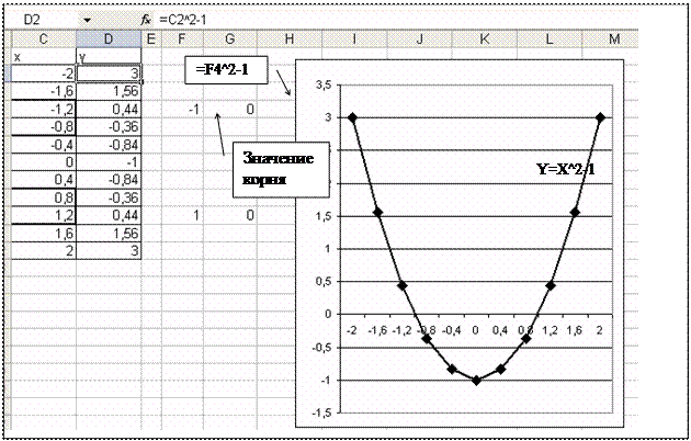 Рис. 3. Нахождение корней уравнения с помощью средств Подбор параметра Далее для каждого отрезка нужно применить средство Подбор параметра для уточнения корня на этом отрезке. Выделить ячейку G4, воспользоваться командой Сервис|Подбор параметра. В поле Установить в ячейке должна быть указана ссылка на ячейку G4. В поле Значение ввести значение 0. В поле Изменяя значение ячейки указать ссылку на ячейку F4. Excel найдет решение и поместит его в ячейку F4. То же самое нужно проделать для второго отрезка, чтобы найти второй корень. В этой задаче корнями уравнения будут значения -1 и 1.