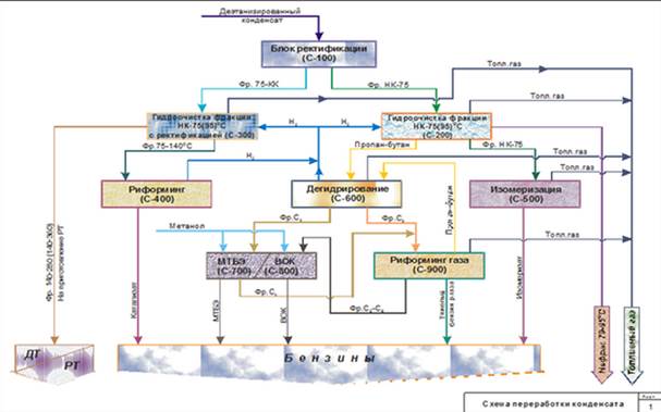 Рисунок 2 - Технология переработки газового конденсата в высококачественные топлива Набор технологических процессов по переработке газоконденсатного сырья проектируются как единый комплекс, что исключает удорожание строительства, упрощает эксплуатацию и дополнительные межцеховые перекачки.
