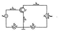 3. Определите коэффициент усиления по напряжению трехкаскадного усилителя в децибелах, если каждый каскад обеспечивает десятикратное усиление. 4. В транзисторе марки КТЗ15А, включенном по схеме с общим эмиттером, ток базы изменился на 0,1 мА. Как при этом изменится ток эмиттера, если коэффициент усиления α=0,975? 5. Какие микросхемы называют гибридными? 6. При включении биполярного транзистора Т по схеме с общей базой коэффициент усиления по току равен 0,95. Чему равен коэффициент усиления по току биполярного транзистора, если его включить по схеме с общим эмиттером, как показано на рис.?