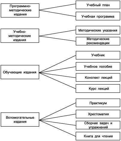 Выделяют четыре группы изданий, методика редакторской подготовки которых учитывает целевое их назначение и характер информации. Учебные планы и учебные программы (примерные, рабочие) составляют группу программно-методических изданий. Методические указания, рекомендации составляют группу учебно-методических изданий. Учебники, учебные пособия, конспекты и тексты лекций составляют группу обучающих изданий. Практикумы, сборники задач и упражнений, хрестоматии, книги для чтения составляют группу вспомогательных изданий (схема 1).