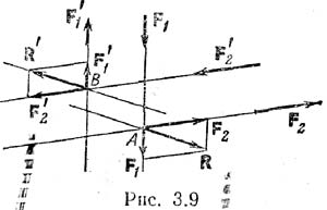 Теорема 1. Две пары, лежащие в одной плоскости, можно заменить одной парой, лежащей в той же плоскости, с моментом, равным сумме моментов данных двух пар. Для док–ва рассмотрим две пары (F1, F`1) и (F2, F`2) (рис. 3.9) и перенесем точки приложения всех сил вдоль линий их действия в точки А и В соответственно. Складывая силы по аксиоме 3, получим R=F1+F2 и R'=F`1+F`2, но F'1=–F1 и F`2=–F2. Следовательно, R=–R', т. е. силы R и R' образуют пару. Момент этой пары: М=М(R, R')=ВАxR=BAx(F1+F2)=ВАxF1+ВАxF2. (3.14). При переносе сил, составляющих пару, вдоль линий их действия ни плечо, ни направление вращения пары не меняются, следовательно, не меняется и момент пары. Значит, ВАхF1=M(F1, F'1)=M1, ВАxF2=M(F2, f`2)=M2, и формула (З.14) примет вид M=M1+M2, (3.15) ч.т.д. Сделаем два замечания. 1. Линии действия сил, составляющих пары, могут оказаться параллельными. Теорема остается справедливой и в этом случае. 2. После сложения может получиться, что М(R,R')=0; на основании замечания1 из этого следует, что совокупность двух пар (F1, F`1, F2, F`2)~0 9- элементарное преобразование системы сил Элементарные преобразования матрицы — это такие преобразования матрицы, в результате которых сохраняется эквивалентность матриц. Таким образом, элементарные преобразования не изменяют множество решений системы линейных алгебраических уравнений, которую представляет эта матрица. Элементарные преобразования используются в методе Гаусса для приведения матрицы к треугольному или ступенчатому виду 10-теорема пуансо. Теорема Пуансо Всякую пространственную систему сил можно заменить эквивалентной системой, состоящей из силы, приложенной в выбранном центре и равной главному вектору, и пары сил, момент которой равен главному моменту всех сил относительно выбранного центра. 11- теорема о приведении системы сил к заданному центру Теорема о параллельном переносе силы: силу F, не изменяя ее действие на абсолютно твердое тело, можно переносить из данной точки (А) в любую другую точку (О) тела, прибавляя при этом пару с моментом (m), равным моменту переносимой силы относительно точки (О), куда сила переносится [ m = mo (F)]; {F} ~ {F, m}.
