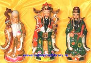 символизируют три важнейших вида удачи семьи. Материальное благополучие представляет Фук. Власть и авторитет семьи поддерживает Люк, который держит в левой руке скипетр или папирус - как символ власти. Здоровье и долголетие укрепляет Сау с персиком в левой руке. Сектор Багуа - центр и входная дверь. Здоровье и благополучие