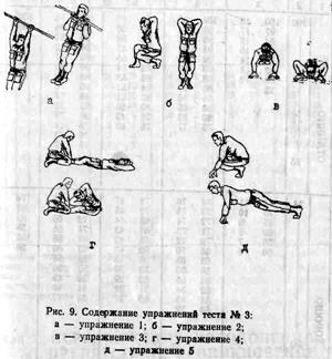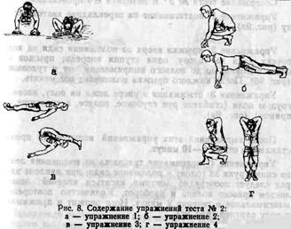Наиболее информативным тестом определения уровня развития силовой выносливости военнослужащих до 36 лет является комплекс, состоящий из четырех видов общеразвиваю- щих упражнений. Каждое упражнение проделывается 10 раз с высоким техническим качеством выполнения под счет преподавателя (инструктора) без перерыва для отдыха (10+ + 10+10+10 раз). Темп подсчета средний. Исходное положение начала теста — упор присев. Упражнение 1: отжимания в упоре лежа на полу (рис. 8а) — 10 раз (при сгибаниях рук грудью касаться пола). Упражнение 2: переходы из упора присев в упор лежа и обратно (рис. 8б) — 10 раз. По завершении упражнения лечь на спину. Упражнение 3: доставание двумя ногами (носками) пола за головой, лежа на спине, руки за голову или вдоль туловища (рис. 8в) — 10 раз (ноги в коленный суставах не сгибать). После 10-го выполнения упражнения – в упор присев. Упражнение 4: прыжок вверх из исходного положения сидя на корточках, руки за голову, одна нога чуть впереди другой (рис. 8г). Прыжок невысокий, но до полного выпрям- ления ног и туловища. Приземляясь, менять положение ног в приседе на корточках (руки — все 10 прыжков за головой). Это первая серия выполнения всего комплекса. По методике проведения тестирования следует сразу переходить к повторному выполнению этого же комплекса, также начиная с первого упражнения. И таким образом выполнить несколько серий подряд. Для тренировки личного состава можно одному инструктору подсчитывать результаты для целой группы. На испытании следует назначать одного счетчика для двух испытуемых.