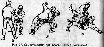 Этот вид самостраховки начинается с освоения конечного положения (группировки), в которое обучаемые должны приходить после падения. В группировку (рис.96) необходимо научиться приходить из положения лежа. Надо выполнить хлопок одной рукой по ковру и подтянуть ноги к груди; при этом ногу, одноименную руке, производящей хлопок, следует положить согнутую на ковре около руки, другую ногу поставить на ковер на уровне середи- ны голени лежащей ноги. Для закрепления группировки перекатываться с боку на бок (на спине). После усвоения группировки следует изучать самостраховку в падении из положений сидя, руки вытянуты вперед, упора присев, стойки. При выполнении самостраховки голову назад не откидывать. Для закрепления правильного падения на бок с выполнением самостраховки хорошо использовать бросок задней подножкой, показанный на рис. 97.