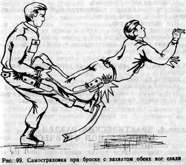 При падении вперед необходимо сгибать руки, амортизируя удар. Падение на выпрямленные руки запрещается. Для закрепления правильного падения рекомендуется в парах попеременно выполнять броски с захватом двух ног сзади (рис. 99). Захваты ног за подколенные сгибы облегчают проведение броска. Как уже подчеркивалось, все эти специальные упражнения в различной мере могут и должны использоваться на каждом занятии по рукопашному бою в процессе изучения различных тем.