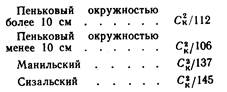 Пример. Необходимо подобрать пеньковый трос для рабочего усилия 1000 кгс. Решение, 1. Приняв п=8, из формулы (3.2) находим: 2. Для пенькового бельного троса тросовой работы k=0.59. 3. По формуле (3.1) находим: 8000=0,59 (3,14 d)2, т. е. Ск=116 мм; d=37 мм. Ниже приведена масса q (в кг) растительных тросов погонной длиной 1 м: