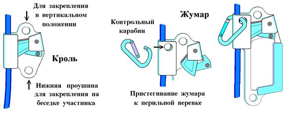 Жумар 1.6.1. Механический зажим кулачкового типа, для фиксации на веревке. Жумар оснащен удобной ручкой. На соревнованиях допускаются только стандартные, изготовленные в производственных условиях, жумары, имеющие гарантированную прочность (без остаточных деформаций), не менее 500кГ по техническому паспорту изделия. Применение самодельных аналогов, как для страховки, так и для других действий, недопустимо. 1.6.2. Жумар применяется для подъема по веревке, для ее натяжения (не более 200кГ на жумар) и при подъеме грузов, для верхней фиксирующей страховки и для самостраховки на вертикальных перилах. При этом должны соблюдаться правила пристегивания и работы. 1.6.3. Жумар пристегивается к вертикальной перильной веревке ручкой вниз, к веревке тяги ручкой в сторону тяги. Через специальные отверстия в щечках веревка, к которой пристегнут жумар, фиксируется контрольным карабином. Для фиксации используется легкий, скалолазный карабин без муфты. К отверстию в ручке жумара пристегивается самостраховка участника или опорное стремя. 1.6.4. Жумар имеет хорошее сцепление и работает на 9-11мм, сухой и мокрой веревке. На веревке, покрытой льдом, он проскальзывает. 1.6.5. При проверке работоспособности жумар должен надежно держать на круглой веревке, диаметром сечения, начиная с 8мм.