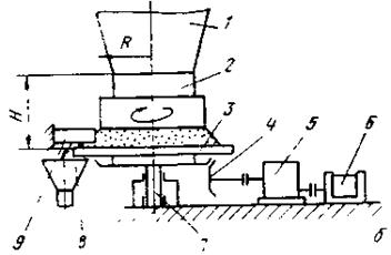где: D – наружный диаметр шнека, м; s – шаг винта шнека, м; n – частота вращения шнека, об/с; φ – коэффициент, заполнения корпуса шнека материалом: при подаче кусковых материалов φ = 0,2÷0,35; при подаче порошковых материалов с подпором φ = 0,85÷0,9. Тарельчатый питатель (рис. 45) состоит из бункера 1, на горловине которого закреплена манжета 2 для регулирования высоты Н подаваемого материала. Материал засыпается на тарелку 3, вращающуюся от электродвигателя 6 через редуктор 5 и коническую передачу 4. Тарелка представляет собой усиленную ребрами Жесткости круговую пластину, вращающуюся в опорах 7. Материал ножом 9 сбрасывается в разгрузочную воронку 8. Быстро изнашиваемые части (ножи, тарель) футеруют чугунными сменными листами или наплавляют твердым сплавом. Жесткая конструкция корпуса тарельчатого бункера, надежность в работе позволяют устанавливать его под бункерами с дробленой рудой перед мельницами. Однако он плохо работает на пылевидных, влажных и глинистых материалах.