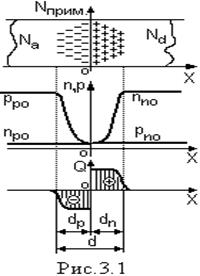 В n-области основные носители электроны, в р-области – дырки. При не слишком низких температурах эти примеси ионизированы практически полностью. Поэтому концентрация электронов в n-области nnо = Nd, а концентрация дырок в р-области рро = Na. Помимо основных носителей эти области содержат неос-новные носители заряда, которые возникают за счет перехода электронов из валентной зоны в зону проводимости: в n-области дырки с концентрацией рno, в р-области электроны с npo. Их концентрации можно определить, используя соотношение nnopno = npoppo = ni2, (3.1) где ni – собственная концентрация носителей заряда. Если Nd, Na >> ni, то концентрация электронов nno в n-области много больше концентрации электронов npo в р-области, а концентрация дырок ррo в р-области много больше концентрации дырок рno в n-области. Такое различие в концентрации однотипных носителей в контактирующих областях приводит к возникновению диффузионных потоков основных носителей заряда: электронов из n-области в р-область (nn→p) и дырок из р-области в n-область (pp→n). При этом электроны, перешедшие в р-область, рекомбинируют вблизи границы раздела с дырками этой области, а дырки, перешедшие в n-область, рекомбинируют вблизи границы раздела с электронами этой области. В результате в приконтактном слое n-области практически не остается свободных электронов и в нем формируется неподвижный объемный положительный заряд ионизированных атомов донора. В приконтактном слое р-области практически не остается дырок и в нем формируется неподвижный объемный отрицательный заряд ионизированных атомов акцептора. Внешние границы областей пространственных зарядов можно считать границами р-n-перехода. На рис 3.1.б показано распределение свободных носителей заряда в области р-n-перехода, а на рис.3.1.в неподвижные объемные заряды, образовавшиеся в этом переходе.