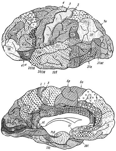 ЦИТОАРХИТЕКТОНИЧЕСКИЕ ПОЛЯ КОРЫ ПОЛУШАРИЙ И ЛОКАЛИЗАЦИЯ КОРКОВЫХ КОНЦОВ I И II СИГНАЛЬНЫХ СИСТЕМ (рисунок 14)