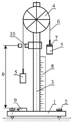 Установка (рис.2) представляет собой массивное основание 1 с регулировочными винтами 2, на котором жестко крепится стойка 3. В верхней части стойки на специальном кронштейне закреплен легкий блок 4. Подвижные грузы 5 закрепляются на концах нити 6, переброшенной через блок 4. Перегрузок 7 обеспечивает движение системы грузов с ускорением. Вдоль стойки 3 закреплена металлическая линейка 8 с миллиметровой шкалой, служащая для измерения координат начального и конечного положения грузов. Захват 9 удерживает систему в исходном положении. Для остановки системы и фиксации конечного положения грузов служит кронштейн со стопором 10, который может перемещаться вдоль стойки 3. 1.Заполните табл.1 спецификации измерительных приборов и запишите данные установки. Таблица 1.