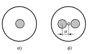 2.Помещают на диск исследуемое тело массой m1, так, чтобы равномерное натяжение нитей не нарушилось. Повторяя измерения, находят по формуле (9) момент инерции системы J1. Так как момент инерции - величина адаптивная, то J1= J0+ J. Вычисляют момент инерции данного тела: J= J1- J0. 3.Проверяют теорему Штейнера, пользуясь двумя одинаковыми телами. Для этого определяют момент инерции одного тела J2, установленного таким образом, чтобы ось вращения проходила через его центр тяжести (рис.2а). Сдвигают тело на некоторое расстояние а и устанавливают симметрично такое же тело для сохранения горизонтального положения диска (рис.2б). Снова определяют момент инерции системы J3. Обозначим момент инерции одного из грузов относительно оси вращения трифилярного подвеса через J4. Момент инерции системы равен J3= J0+2 J4, откуда