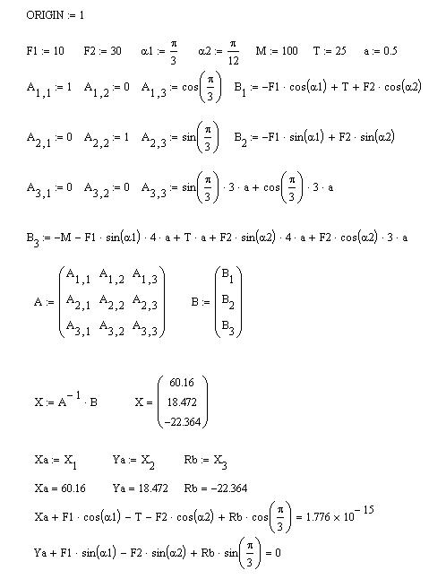 Рис. 34 Решение задачи «Равновесие произвольной плоской системы сил» с помощью системы MathCAD Ответ: