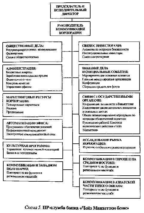 По содержанию своей деятельности и кругу решаемых задач функциональная подсистема паблик рилейшнз (отдел ПР) должна подчиняться непосредственно высшему руководству организации. Однако нередки случаи, когда она подчиняется одному из функциональных подразделений, например, службе рекламы, маркетинга, юридической или по управлению персоналом. Такая подчиненность лишает подсистему паблик рилейшнз ее основной функции: популяризатора и интерпретатора социальной миссии, политики и программ деятельности организации, направленных на связь с общественностью. Поэтому, исхода из того, что принципы политики, общая стратегия организации формируются высшим руководством, работа отдела паблик рилейшнз должна в первую очередь подчиняться непосредственно тем, кто руководит организацией в целом: президенту компании, исполнительному директору и т.д. Крайне важно, как уже отмечалось, чтобы руководитель ПР-подразделения входил в состав руководящей команды организации в качестве одного из заместителей исполнительного директора, занимая, например, кресло вице-президента, заместителя директора и пр. по вопросам паблик рилейшнз. Не стоит опять-таки забывать, что работа руководителя ПР-подразделения заключается в укреплении репутации организации в целом. Если руководитель ПР-подразделения подчиняется, скажем, директору по маркетингу или рекламе, его работа сужается и сводится к простому продвижению конкретных товаров или услуг на рынке. Подчиненность ПР одному из функциональных подразделений приводит к потере независимости, доверия со стороны общественности и, следовательно, к потере своей роли объективного советника высшего руководства компании. Конечно, автономность подсистемы паблик рилейшнз не может быть абсолютной. Наоборот, ее деятельность может и должна согласовываться с работой других функциональных подразделений, ставящих своей целью общее благополучие организации. Но при этом подразделение паблик рилейшнз не должно отклоняться от своей специфической роли - поддерживать у общественности доверие к организации как целостному организму, следить за тем, чтобы руководство в любой сфере деятельности постоянно принимало в расчет общественные интересы. Чрезвычайно важно, чтобы подразделение паблик рилейшнз находило достойное место в организационной структуре корпорации, фирмы и т.д. и чтобы его функциональные обязанности отделялись от обязанностей других подразделений организации. Это поможет надежно и четко распределять и специализировать деятельность подразделений, установить их вертикальную иерархию и функциональную нагрузку внутри организации. Приведем несколько примеров общих организационных схем, распространенных в современной практике менеджмента (См.: Cutlip S.M., Center А.Н., Broom G.M. Effective Public Relations: 7th ed. - N.J.,1994.-P.68,69). Схема 1 определяет место службы паблик рилейшнз в структуре простейшей системы управления функционального типа Схемы 2,3,4 демонстрируют примеры функциональной структуры ПР-подразделения небольшой, средней и крупной по размеру организации (схема 4 вынесена в конец книги). Схема 5 иллюстрирует построение службы связей (коммуникации) с общественностью известного американского банка "Чейз Манхеттен бенк". Коммуникационные операции с различными группами общественности осуществляет тут большая групп