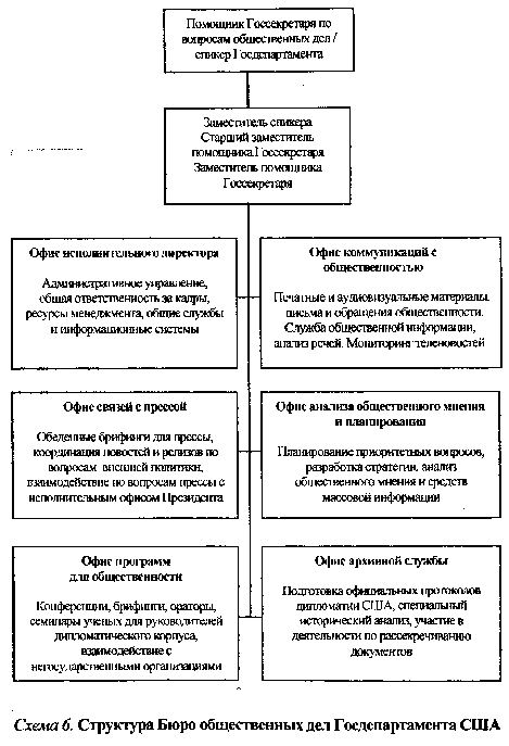 Для сравнения приведем примеры из практики создания отдельных подразделений в государственных органах Украины, которые в определенной мере начинают выполнять функции паблик рилейшнз (схемы 7,8,9). Основной недостаток этих подразделений отечественных государственных учреждений, по нашему мнению, заключается в том, что они нередко отдалены от высшего руководителя, не входят в круг "руководящей команды", выполняют лишь "запланированные" инструментальные функции. Например, в структуре аппарата Администрации Президента Украины (см. схему 7) пресс-служба (традиционная пресс-посредническая функция) подчинена Главе Администрации Президента. Кроме того, много ПР-функций возложено на Главное управление внутренней политики, подчиненное одному из заместителей главы АП. То есть, помимо отдаленности от высшего руководства, в данном случае заметно и существенное рассредоточение ПР-функций в структурном отношении, что может привести и нередко приводило в прошлом к противоречивости информации, поступающей от Администрации Президента. Важным шагом по преодолению такого положения можно считать все более активное участие Главы АПУ в коммуникационной работе. Особого рода недостатки свойственны структуре аппарата и секретариата Верховной Рады Украины (см. схему 8), в которой ПР-функции в соответствии с непосредственными служебными обязанностями фактически возложены на ряд отделов и пресс-службу, подчиняющихся руководителю секретариата. Здесь опять-таки данные подразделения оказывается существенно отдаленным от руководства Верховной Рады. С другой стороны, эти службы скорее обслуживают деятельность Верховной Рады Украины как законодательной ветви власти, чем несут ответственность за связи с общественностью собственно аппарата Верховной Рады. Что касается Кабинета Министров Украины (см. схему 9), то тут пресс-служба по сравнению с предыдущими примерами наиболее приближена к руководству (Премьер-министру Украины). Однако она опять-таки выполняет скорее пресс-посредническую функцию, выступающую лишь одной составляющей многогранной системы ПР. Более содержательная работа в этом отношении в последнее время возлагается на Правительственного секретаря Кабинета Министров, а также управления по вопросам местных госадминистраций и органов местного самоуправления, международного сотрудничества, взаимодействия с Верховной Радой и общественно-политическими организациями, развития межгосударственных сношений со странами СНГ и уставными органами содружества, приема официальных делегаций и протокольного обеспечения и некоторые другие, подчиненные также одному из заместителей Правительственного секретаря Кабмина. Итак, во всех приведенных примерах так и не обнаружилось случая, чтобы служба или подразделение связей с общественностью (паблик рилейшнз) были включены в функциональную структуру государственного органа наравне с другими линейными подразделениями.