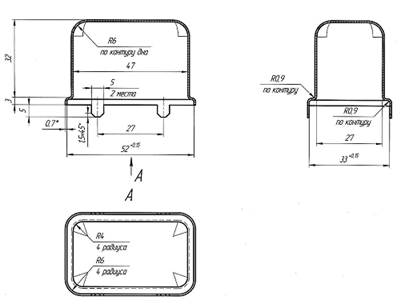 Рисунок 1 Чертеж детали Корпус РС530 Холодная штамповка относится к технологическим процессам обработки металлов давлением без их предварительного нагрева. Чтобы осуществить разработку оснастки для изготовления детали необходимо разработать технологический процесс. Исходными данными являются: чертеж и технические условия на изготовление детали; объем производства; технические характеристики имеющегося оборудования, на котором может быть изготовлено изделие; сроки подготовки и освоения производства детали. Проектирование технологического процесса начинают с анализа формы и размеров изделия, затем выбирают операции и определяют их последовательность. Одновременно разрабатывают несколько вариантов технологических процессов, затем проводят их экономическое сравнение и выбирают вариант, обеспечивающий наименьшие затраты на изготовление изделия. Технологический процесс изготовления данной детали «Корпус» может включать в себя операции вырубки заготовки, несколько операций вытяжки и, возможно, межоперационный отжиг. Вырубка - является начальной операцией для изготовления всех деталей из полосы или ленты. Вырубка применяется не только как отдельная операция, но и в сочетании с другими операциями холодной штамповки. Прежде чем разрабатывать технологический процесс изготовления детали, технолог должен проверить ее технологичность, т. е. установить, при каком сочетании ее конструктивных элементов, материала и его качества изготовление будет наиболее простым и экономичным, а эксплуатационные показатели — наиболее высокими. Анализ технологичности штампуемой детали проводят обязательно с учетом конкретных производственных условий и масштаба производства. При массовом производстве штампуемых деталей основными показателями при оценке технологичности являются расход материала и трудоемкость изготовления.