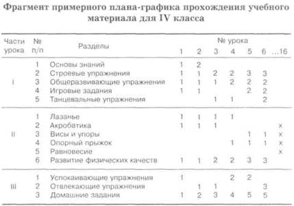 В плане-графике прохождения учебного материала предусматриваются количество видов упражнений и их сочетаний на каждом занятии, сроки контрольных уроков, чередование упражнений на уроках, последовательность прохождения учебного материала по разделу в целом. Он составляется на основе рабочей программы. Как правило, вначале распределяется материал для основной части урока, затем для подготовительной и заключительной частей. В окончательном варианте план-график оформляется в виде таблицы.