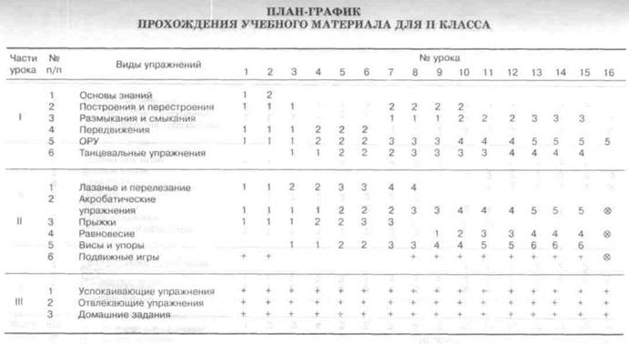 упражнения без предметов. С их помощью можно успешно решать самые разнообразные задачи. Новизна и необычность являются несомненными признаками, по которым их можно отнести к упражнениям, оказывающим большое влияние на развитие разнообразных координационных способностей. В каждый урок следует вносить новые общеразвивающие упражнения или их варианты, так как многократное повторение одних и тех же упражнений не дает нужного эффекта, будет неинтересно ученикам. Если применяются знакомые упражнения, их следует выполнять при изменении отдельных характеристик движения (пространственных, временных, силовых). Одним из важнейших средств всестороннего развития способностей учащихся, усвоения разнообразных навыков (письмо, рисование, резьба, лепка, конструирование) и стимулирования умственной активности младших школьников являются общеразвивающие упражнения с предметами. Значительное место на уроках с учащимися младших классов отводится подвижным играм и игровым заданиям. В занятиях с учащимися I—II классов обычно проводится одна-две игры, III- IV классов — по одной. При этом рекомендуется вначале, особенно в I классе, давать групповые игры. С приобретением двигательного опыта и с повышением у детей интереса к коллективной деятельности можно включать в уроки командные игры с элементами соревнования. Игры необходимо подбирать так, чтобы их двигательное содержание не повторялось при выполнении других упражнений. Например, при обучении кувыркам не следует проводить игру с кувырками. Во-первых, при обучении кувыркам учитель стремится к тому, чтобы дети овладели техникой кувырка, и часто избирает для этого метод расчлененного разучивания, а кувырки в игре, выполняемые как элементы игрового процесса, не будут выполняться так точно, как того хотелось бы, и, следовательно, не будут способствовать закреплению пройденного на уроке материала. Во-вторых, сочетание кувырков как одного из основных видов упражнения в уроке и кувырков в игре создает предпосылки для одностороннего, ограниченного воздействия на организм учащихся. Не следует также включать в игры еще малоосвоенные упражнения, так как это может привести к образованию неправильного навыка в движениях. При выборе игры существенное значение имеет ее содержание. Не рекомендуется на одном уроке проводить игру со сложными правилами и вести обучение технически сложным упражнениям. Комплексной программой по физическому воспитанию в начальных классах общеобразовательной школы для освоения ба- зовой части содержания программного материала раздела гимнастики при двухразовых занятиях в неделю отводится по 16 уроков на каждый класс. Приведем примерные рабочие программы и планы-графики прохождения учебного материала для учащихся начальной школы. Тематизированная рабочая программа для I класса I. Подготовительная часть урока 1. Основы знаний. Тема 1/1 — названия снарядов, используемых в занятиях с учащимися I класса, правила безопасности во время занятий. Тема 2/1 — признаки правильной ходьбы, бега. 2. Строевые приемы. Тема 2/4 — повороты налево и направо на месте. 3. Построения и перестроения. Тема 1/3 — построение в колонну. Тема 2/3 — построение в шеренгу. Тема 3/3 — построение в круг. Тема 4/3 — перестроение по звеньям. 4. Передвижения. Тема 1/4 — команды: «Шагом — МАРШ!» и «Класс — СТОЙ!». 5. 