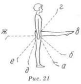 При определении движений ногами в основных и промежуточных плоскостях указывается название ноги и направление выполняемого движения. Движения ног в лицевой плоскости (рис. 20): а) правую в сторону на носок; б) правую в сторону-кни-зу; в) правую в сторону; г) правую в сторону-кверху. Движения в боковой плоскости (рис. 21); а) левую на носок; б) левую вперед-книзу; в) левую вперед; г) левую вперед-кверху; д) левую назад на носок; е) левую назад-книзу; ж) левую назад.
