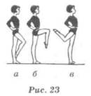 При выставлении ноги на носок в том или ином направлении указывается нога, которой делают движение, направление движения и словосочетание «на носок». Например, правую на носок в сторону. Здесь опускаются слова «нога» и «выставить». В отдельных случаях, если не совсем понятно, чем производится движение (рукой или ногой), следует это указать. Для обозначения сгибания ног в коленном суставе применяется термин «согнуть» и указывается нога. Например, согнуть правую, стопа находится у голени опорной ноги. Если же движение выполняется с отведением ноги, то после слова «согнуть» указывается направление движения ногой. В этом случае нога сгибается до прямого угла или несколько выше, но голень должна быть параллельна опорной ноге. В боковой плоскости (рис. 23): а) согнуть правую; б) согнуть правую вперед; в) согнуть правую назад.
