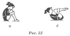 3. Поза для сна (драбхасана). Лечь на правый бок, ноги вытянуты (колени можно подобрать). Правую ладонь под голову, левую сверху вдоль туловища. Глаза закрыты. Дыхание спокойное, утихающе-ритмичное. Снимаете сначала напряжение тела — с ног до головы. Думы в сторону. И вы постепенно уходите в сон, глубокий и потому без сновидений, хорошо освежающий. Вторая группа Упражнения предназначаются главным образом для развития пластичности мышц спины и сухожилий ног, а также для развития подвижности позвоночника и ребер. 1. Самообхват (паванамуктасана). И. п. — сидя, пятки руками приблизить к промежности (ноги не касаются пола). Для мужчин: левой рукой обхватить запястье правой, а для женщин — наоборот. Согнуть спину и приблизить голову к коленям. Сесть на одну точку в районе копчика, удерживая некоторое время равновесие, снять лишнее напряжение, дышать свободно и ритмично (рис. 52, а).