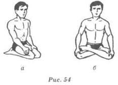 При движении назад — вдох, при движении вперед — выдох. Начинающим упражнение следует выполнять на достаточно мягкой подстилке. По мере освоения асаны заменить подстилку обычным мягким ковриком. Поначалу следует делать не более 5-7 перекатов. 4. Сидение на пятках (ваджарасана). Ваджарасана очень простая и удобная поза для занятий дыхательными упражнениями, медитацией. И. п. — соединить ноги и встать на колени, оттянуть носки и немного развести пятки, чтобы образовалась лунка. Сесть ягодицами в лунку, спину и голову держать прямо, руки расслабить и положить на колени (рис. 54, а). Эта по- за способствует лучшему перевариванию пищи, поэтому может выполняться после еды. Кроме того, оказывает влияние на многие внутренние органы, увеличивает в них циркуляцию крови, способствует обретению уравновешенности, твердости духа, уверенности в своих силах. 5. Лотос (падмасана). Полный лотос — это поза повышенной трудности, требует хорошей подвижности в тазобедренных суставах (рис. 54, б).