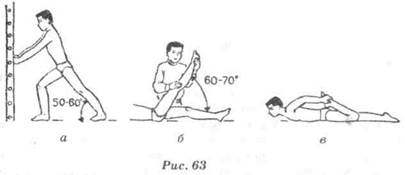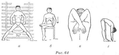 Разведение ног в тазобедренных суставах. Раздвинуть ноги как можно шире при условии, что туловище должно быть направлено строго вверх, а стопы — вперед, руками можно опираться о гимнастическую стенку (рис. 64, а). В норме угол между ногами должен составлять не менее 90°. Супинация ноги в тазобедренном суставе. Сесть на стул, одну ногу поднять, согнуть и положить на колено другой (рис. 64, б). В норме голень согнутой ноги приводится с помощью рук в горизонтальное положение. Разгибание плеча вверх. Сесть на стул, поднять руки, согнуть их так, чтобы пальцы были направлены к лопаткам. В норме кончики пальцев скрещенных рук должны касаться нижнего края лопаток (рис. 64, в). Наклон вперед. Встать прямо, соединив ноги. Наклониться вперед, не сгибая при этом ноги и свесив расслабленные руки вниз (рис. 64, г). В норме кончики пальцев должны касаться пола. Это достижение свидетельствует о хорошей гибкости позвоночника и хорошей растяжимости задней поверхности бедра. Наклоны назад. Лечь на живот. Стопы под первой рейкой гимнастической стенки или прижимаются к полу партнером