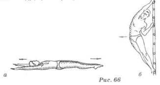 Повороты туловища в сторону. Сесть на стул и развести ноги как минимум на 50 см, упереться руками в колени. Не меняя положения таза и ног, развернуть туловище как можно дальше назад. Во избежание малейшего поворота в области таза коленями можно упереться в стену. В норме при повороте в сторону-на-зад тестируемый должен видеть поднятые над головой руки партнера, стоящего на расстоянии 2 м сзади (рис. 65, в). При выполнении упражнений стретчинга необходимо соблюдать следующие правила: 1. При положении сустава в крайнем разогнутом, согнутом, отведенном/приведенном и т. д. положении не покачиваться. Растягивать связки и мышцы только за счет статического давления, находясь в неподвижном состоянии. 2. Прежде чем выполнять упражнение, надо знать, какую конкретную группу мышц оно растягивает. 3. Во время выполнения упражнения дышать спокойно и ритмично. 4. Прекратить упражнение сразу при появлении острых болевых ощущений. 5. Повторять каждое упражнение до 5-7 раз с продолжительностью интервалов отдыха между повторениями в 5-10 с. 6. Во время отдыха между повторениями стремиться к полному расслаблению. Приведем несколько наиболее распространенных упражнений стретчинга, которые целесообразно выполнять в основной части урока гимнастики в школе и дома как домашнее задание. 1. Растягивание мышц всего тела. В и. п. лежа на спине выпрямить пальцы рук и ног. Потянуться, стараясь растянуть все мышцы тела, пока в них не появится чувство напряжения. Дыхание спокойное. Удерживать достигнутое положение 10-15 с, затем расслабиться и отдохнуть 10 с. Повторить упражнение еще 3-5 раз (рис. 66, а). 2. Растягивание мышц, приводящих и разгибающих плечо, участвующих в боковых наклонах туловища и отводящих бедро. И. п. — боковое положение на нижней рейке гимнастической стенки. Одной рукой взяться на уровне головы, другой пониже. Разгибая руки, прогнуться в сторону, удерживать конечное положение 20-30 с (рис. 66, б) и вернуться в и. п. После отдыха 6- 10 с повторить упражнение еще 2-3 раза в эту же сторону. Затем выполнить в другую сторону. jj
