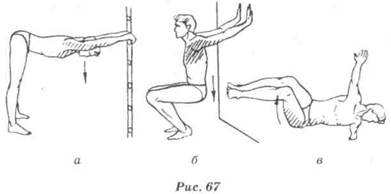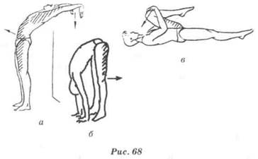 6. Растягивание грудных мышц, мышц передней стенки живота и мышц — сгибателей бедра. И. п. — стоя спиной к стене. В зависимости от роста встать на расстоянии 50-80 см от стены, ноги выпрямлены, ступни врозь, параллельны друг другу. Наклониться назад до касания руками стены и, опираясь руками, вывести таз вперед (рис. 68, а). В крайнем положении при ощущении растяжения мышц прекратить перемещение кистей и удерживать позу 20-30 с. Затем вернуться в и. п. Повторить упражнение 4-6 раз с отдыхом по 15-20 с. 7. Растягивание мышц — разгибателей туловища и бедра. И. п. — стоя ноги врозь. Медленно наклониться вперед, руки свободно опустить вниз и коснуться ладонями пола (рис. 68, б). Вначале коленные суставы слегка согнуть, затем их разогнуть. Следить, чтобы дыхание было спокойным. Удерживать достигнутую позу 20-30 с, затем вернуться в и. п. Повторить упражнение 6-8 раз с отдыхом по 10-15 с. 8. Растягивание мышц, отводящих и разгибающих бедро. В и. п. лежа на спине медленно подтянуть колено к груди, захватив его руками (рис. 68, в). Удерживать эту позу 20-30 с, затем отдохнуть 6-8 с и выполнить то же упражнение, но оказывая давление коленом на ладонь. Вернуться в и. п. и после отдыха 10-15 с повторить упражнение, поменяв положение ног. Всего по 4-6 раз на каждую ногу.