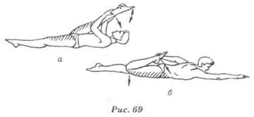 9. Растягивание мышц, разгибающих и приводящих бедро, сгибающих голень. И. п. — лежа на спине. Взять руками голень вытянутой правой ноги и подтянуть к голове, одновременно напрягая и расслабляя стопу. Ощутив растяжение мышц задней поверхности бедра, зафиксировать позу и удерживать ее в течение 20-30 с. Поменять положение ног и после отдыха 5-10 с повторить упражнение (рис. 69, а). 10. Растягивание мышц — сгибателей бедра, разгибателей голени и стопы. И. п. — лежа на животе, согнуть правую ногу в коленном суставе, вытянуть правую руку вверх, левой рукой обхватить голеностопный сустав правой ноги (колено не отрывать от пола) и подтягивать стопу к ягодице, лицо обращено вперед, дыхание спокойное. Удерживать конечную позу 20-30 с. Вернуться в и. п., отдохнуть 5-10 с и повторить упражнение, согнув левую ногу. Выполнить по 4-5 раз с каждой ногой (рис. 69, б).