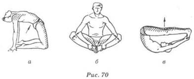 11. Растягивание грудных мышц, мышц передней стенки живота и сгибателей бедра. И. п. — стоя на коленях с разведенными на ширину плеч ступнями. Отвести тело назад и опереться выпрямленными руками о пол, прогнуться в пояснице и наклонить голову назад. Следить за равномерным дыханием. Удерживать эту позу в течение 20-30 с. Вернуться в и. п. и после отдыха 5-7 с повторить упражнение 6-8 раз (рис. 70, а). 12. Растягивание приводящих и разгибающих мышц бедра. И. п. — сидя, ноги согнуть в коленях и развести в стороны, ступни ног соединить вместе, руками обхватить голеностопы, предплечьями упереться во внутреннюю поверхность голени. За счет напряжения мышц ног постараться свести вместе бедра, противодействуя руками этому движению. Длительность напряжения — 15-20 с, отдых — до 30 с (рис. 70, б). 13. Растягивание мышц — разгибателей спины, ягодичных мышц, мышц — разгибателей бедра, сгибателей голени и стопы. Из и. п. лежа на спине прямые руки поднять вверх, перенести ноги через голову до положения, когда ноги будут находиться параллельно полу, пальцами рук обхватить стопы и удерживать достигнутое положение 20-30 с (рис. 70, в). В конечной позе выпрямить ноги, дыхание спокойное. Повторить упражнение 4-6 раз с отдыхом по 10—15 с.