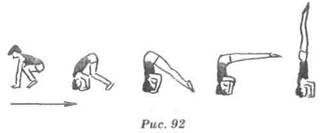 рывая их от пола, необходимо поставить вертикально туловище, а затем поднять ноги: в первом случае — сгибая их в коленях через стойку, согнув ноги (рис. 91), а во втором — разгибаясь в тазобедренных суставах с прямыми ногами (рис. 92). 1. Повторить стойку на голове согнув ноги (VIII кл.). 2. Повторить стойку на голове толчком двумя из упора присев с согнутыми ногами. 3. Из упора присев стойка на голове согнув ноги силой. 4. Из упора присев стойка на голове согнувшись (с прямыми ногами) силой. 1. Неправильное положение рук и головы, описанное ранее. 2. Стойка выполняется толчком двумя или махом одной и толчком другой. 3. Слишком далеко или близко поставлены руки от ног, и при разгибании ног туловище принимает наклонное положение: либо вперед (когда руки поставлены слишком близко к ногам), либо назад (когда руки поставлены слишком далеко от ног). 4. Преждевременное разгибание в тазобедренных суставах (до того момента, когда туловище еще не примет вертикального положения). Страховка и помощь. Стоя сбоку, одной рукой поддерживать под спину, другой под ногу.