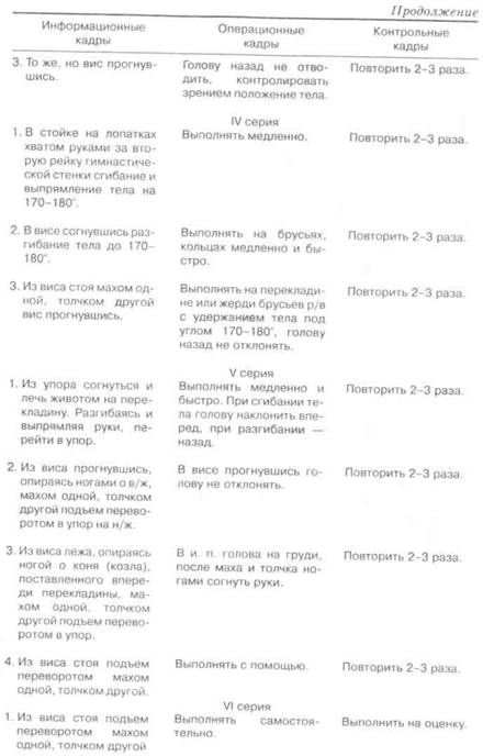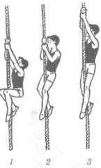 Комбинация для контрольного урока 1. Из виса стоя лицом к в/ж подъем пере в упор на н/ж — 2,5 балла. 2. Перемах левой с перехватом левой за в/ж и поворот направо с перемахом левой в сед на левом бедре снаружи, правую руку в сторону — 1»0 балла. 3. Хватом правой сзади сед углом — 2,0 балла. 4. Сгибая правую ногу, встать и равновесие на ней - 2'° балла- 5. Хватом правой за н/ж упор присев, махом левой назад и толчком правой — 2,5 балла. Требования к уровню физической подготовленности девушек, оканчивающих среднюю общеобразовательную школу, в подтягивании из виса лежа: 18 раз и больше — высокий; 13-15 раз — средний; 6 раз и меньше — низкий. Лазанье по канату в висе на согнутых руках с захватом каната ногами Техника выполнения. В висе на согнутых руках (см. рис. кадр 1) согнуть ноги вперед и захватить канат ногами скрестно так, чтобы наружная сторона стопы одной ноги и внутренняя сторона голени другой (правой или левой) плотно прижимались к канату (кадр 2). Разгибая ноги, подтянуться еще выше и, сохраняя захват каната ногами, поочередно перехватиться руками выше так, чтобы остаться в висе на согнутых руках (кадр 3). Далее действия повторяются. При опускании вниз все действия чередуются в обратном порядке.