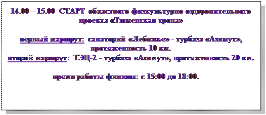 ГРАФИК ПРОГРАММЫ ХХ Фестиваля туристов и путешественников Тюменской области ПРОГРАММА ЗАЯВКИ НА УЧАСТИЕ В СОРЕВНОВАНИЯХ ПРИНИМАЮТСЯ ДО 10 ФЕВРАЛЯ Февраля 2015 г. Открытый турнир Самарской области по спортивной аэробике По фитнес-аэробике Открытое первенство Самарской области среди детей 8-10 лет Открытый чемпионат и первенство Самарской области по фитнес-аэробике Улыбку и не забыть своих друзей Большой чемодан с новогодним веселым настроением Паспорт
