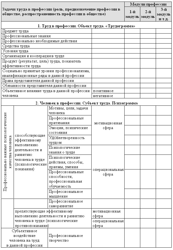 1. Предназначение, "миссия" профессии, ее роль в обществе (производство материальных товаров или идей, оказание услуг в разных социальных сферах; сбор, хранение и передача информации и др.), направленность на человека. 2. Распространенность профессии (типичные для данной профессии учреждения). 3. Предмет труда в профессии - стороны окружающей действительности, на которые воздействует человек в ходе труда (материальные предметы, идеальные предметы - культура, информация, индивидуальное или общественное сознание людей, предметы натуральные в контексте природы и искусственные, созданные человеком.). Правильное видение предмета труда - первый важный шаг к профессионализму. 4. Профессиональные знания как совокупность сведений о сторонах труда в профессии. 5. Деятельности, действия, приемы, умения, способы работы, технологии, техники, применяемые в данной профессии для успешного достижения результата; степень их развернутости, обобщенности, автоматизированности. 6. Средства труда - стороны окружающей действительности (материальные и идеальные объекты), которые человек использует для воздействия на предмет труда при реализации своих целей, для получения нужного продукта труда. К средствам труда относятся реальные инструменты, приборы, компьютеры, оргтехника, а также знаковые средства и системы правил логического мышления, моральной и эстетической оценки и др. Предмет и средства труда могут меняться местами даже в рамках одной профессии. 7. Условия труда: режим труда и отдыха, возможности их варьирования; характеристика социального окружения; санитарно-гигиенические факторы труда; интенсивность, темп труда и продолжительность нагрузки; рабочее место, рабочий пост. 8. Организация и кооперация труда: формы индивидуальной, совместной, групповой деятельности, преобладающие в данной профессии; виды профессионального общения и позиции в нем, обмен средствами и продуктами труда между его участниками; нормы выполнения и сроки; субординация и иерархия подчинения, социальный статус и должности в рамках профессии. 9. Продукт труда (или его результат) - те качественные и количественные изменения, которые человек привносит в предмет труда; критерии оценки результата труда, степень заданности результата труда, его более или менее жесткая регламентация (от исполнительного труда к творчеству). 10. Возможные уровни профессионализма и квалификационные разряды в данной профессии, категории и их оплата. 11. Права представителя данной профессии: психологическая и социальная безопасность, наличие благоприятного микроклимата в профессиональной среде; социальные гарантии, размеры оплаты труда и отпуска, охрана труда; допустимость индивидуального стиля выполнения трудовой деятельности и индивидуального варьирования операции; возможность повышения квалификации, переподготовки на смежные профессии; формы служебного продвижения и поощрения профессионального роста. 12. Обязанности представителя данной профессии: владение профессиональной компетентностью, знание этических норм профессионального поведения (духовность в общении с коллегами); соблюдение профессиональной и служебной тайны в работе с людьми; умелое ведение документации; ограничения (чего не следует делать в профессии никогда). Должностные функциональные обязанности (что и как долж