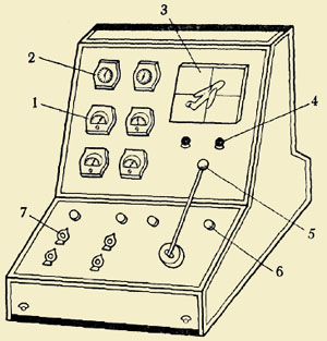 Рис. 2.4. Прибор "Аттенциометр":1 - измерительные приборы; 2 - счетчики импульсов; 3 - модель самолета; 4-7 - органы управления