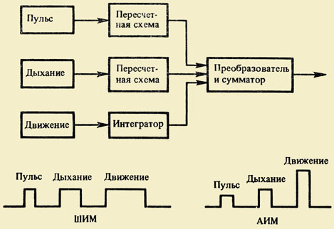 Рис. 2.6. Структурная схема трехканального устройства для анализа физиологических характеристик человека с применением широтно-импульсной (ШИМ) или амплитудно-импульсной (АИМ) модуляции