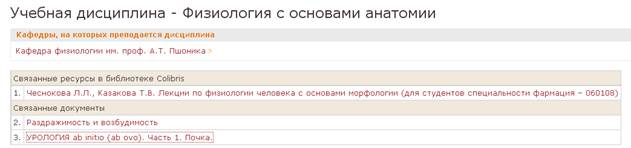 Кликнув мышью на любую дисциплину учебного плана, можно видеть кафедру, на которой данная дисциплина преподается, связанные с ней документы и электронные учебные ресурсы из библиотеки Colibris. Так, например, кликнув по дисциплине Физиология с основами анатомии, мы видим следующее:
