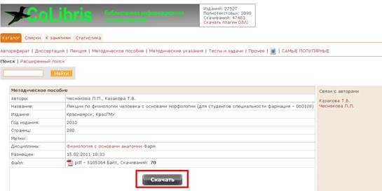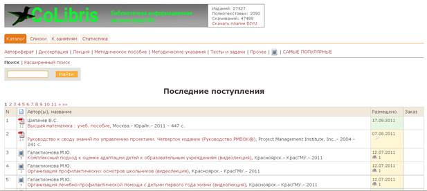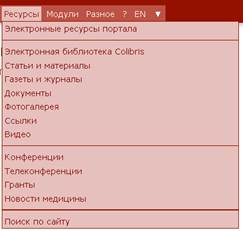Кликнув по меню Электронные ресурсы портала, можно видеть следующие модули: 1. Статьи и материалы 2. Клуб выпускников КрасГМУ "МедУза" 3. Модуль последипломного обучения КрасГМУ 4. Модуль дистанционного обучения КрасГМУ 5. Модуль поиска вакансий в здравоохранении Красноярского края 6. Электронная библиотека КрасГМУ CoLibris 7. Инновационная газета КрасГМУ "Медицинские ведомости" 8. Электронные учебные пособия КрасГМУ 9. Календарь медицинских конференций 10. Модуль телеконференций 11. Справочник МКБ-10 12. Номенклатура медицинских услуг 13. Новости медицины MedLinks 14. Ссылки на медицинские и образовательные ресурсы Интернет 15. Поиск медицинских специалистов 16. Модуль "Задай вопрос специалисту" 17. Запись на прием к врачу 18. Поиск медицинских услуг по прайсам 19. Отзывы и предложения по работе организаций Электронная библиотека Colibris представляет собой электронное хранилище разнообразных ресурсов: · Автореферат · Диссертация · Лекция · Методическое пособие · Методические указания · Тесты и задачи · Видео