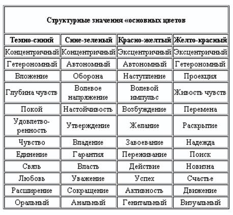 Интерпретация результатов Одним из приемов трактовки результатов выбора является оценка положения основных цветов. Если они занимают позицию далее пятой, значит, характеризуемые ими свойства, потребности не удовлетворены, следовательно, имеют место тревожность, негативное состояние. 1. Интерпретация психологического значения цветов: Подробное описание значения цветов.