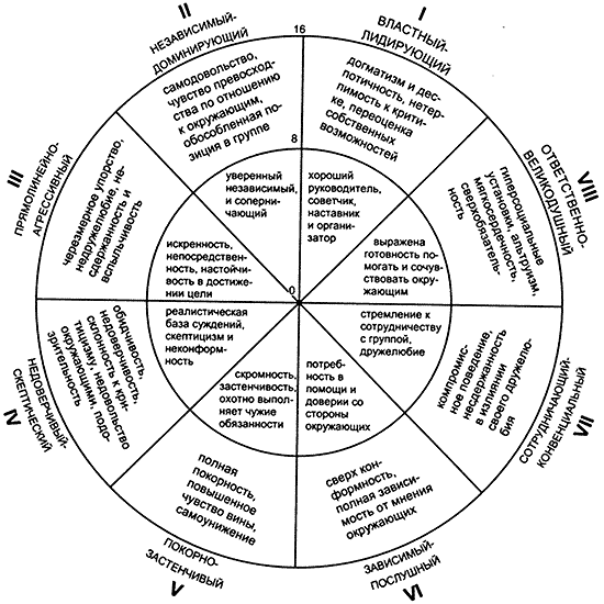 Описание методики Методика диагностики межличностных отношений Лири Данная методика разработана Т. Лири (1954 г.) и предназначена для исследования представлений субъекта о себе и идеальном "Я", а также для изучения взаимоотношений в малых группах. С ее помощью выявляется преобладающий тип отношений к людям в самооценке и взаимооценке. При этом выделяется два фактора: "доминирование-подчинение" и "дружелюбие-агрессивность(враждебность)". Именно эти факторы определяют общее впечатление о человеке в процессах межличностного восприятия. В зависимости от соответствующих показателей выделяются ряд ориентаций - типов отношения к окружающим. Делаются выводы о выраженности типа, о степени адаптированности поведения - степени соответствия (несоответствия) между целями и достигаемыми в процессе деятельности результатами. Очень большая неадаптивность поведения (при представлении результатов выделяется красным цветом) может свидетельствовать о невротических отклонениях, дисгармониях в сфере принятия решений или являться результатом каких-либо экстремальных ситуаций. Методика может использоваться как для самооценки, так и для оценки наблюдаемого поведения людей ("со стороны"). В последнем случае испытуемый отвечает на вопросы как бы за другого человека, основываясь на своем представлении о нем. Суммируя результаты такого тестирования разных членов группы (например, трудового коллектива) можно составить обобщенный "представленческий" портрет какого-либо ее члена, например, лидера. И делать выводы об отношении к нему других членов группы. Методика создана Т. Лири, Г. Лефоржем, Р. Сазеком в 1954 г. и предназначена для исследования представлений субъекта о себе и идеальном "Я", а также для изучения взаимоотношений в малых группах. С помощью данной методики выявляется преобладающий тип отношений к людям в самооценке и взаимооценке. При исследовании межличностных отношений наиболее часто выделяются два фактора: доминирование-подчинение и дружелюбие-агрессивность. Именно эти факторы определяют общее впечатление о человеке в процессах межличностного восприятия. Они названы М. Аргайлом в числе главных компонентов при анализе стиля межличностного поведения и по содержанию могут быть соотнесены с двумя из трех главных осей семантического дифференциала Ч. Осгуда: оценка и сила. В многолетнем исследовании, проводимом американскими психологами под руководством Б. Бейлза, поведение члена группы оценивается по двум переменным, анализ которых осуществляется в трехмерном пространстве, образованном тремя осями: доминирование-подчинение, дружелюбие-агрессивность, эмоциональность-аналитичность. Для представления основных социальных ориентации Т. Лири разработал условную схему в виде круга, разделенного на секторы. В этом круге по горизонтальной и вертикальной осям обозначены четыре ориентации: доминирование-подчинение, дружелюбие-враждебность. В свою очередь, эти секторы разделены на восемь – соответственно более частным отношениям. Для еще более тонкого описания круг делят на 16 секторов, но чаще используются октанты, определенным образом ориентированные относительно двух главных осей. Схема Т. Лири основана на предположении, что чем ближе оказываются результаты испытуемого к центру окружности, тем сильнее взаимосвязь этих двух 