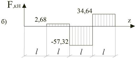 Рис.4 (а,б,в) – Схема навантаження балки та опори не поперечних сил і згинальних моментів. 3. Рівняння рівноваги мають вигляд: Σ FZi=0; RAZ – F2 cos α = 0 (1) Σ MA = 0; –M – F1·l + RBY 2·l – F2 3·l sin α = 0 (2) Σ MB = 0; –M – RAY 2·l + F1·l – F2·l sin α = 0 (3) 4. Розв’язуємо рівняння: RAZ = F2cos = cos 60˚ = 20 RBY = RAY = Перевірка: Σ Fy = 0 = RAY – F1 + RBY – F2 sin α = 2,68–60+91,96–34,63