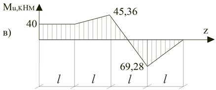5. Будуємо епюру поперечних сил починаючи з лівого кінця балки (рис.4.б) (напрям осі Y прийнято за позитивний). 6. Будуємо епюру згинальних моментів (рис.4.в). Побудову також починаємо з лівого краю, де прикладений момент M = 40 кНм. Використовуємо правило знаків: «момент, який згинає балку опуклістю до гори, вважаємо від’ємним і навпаки. Поперечні перерізи балки позначимо номерами: 1,2,3,4,5. - Ділянка балки між перерізами 1 і 2 навантажена моментом M1,2 = 40 кНм. - Переріз 3 навантажений згинальним моментом M3 = M + RAY·l = 40+2,68·2= 45,36 кНм. - Переріз 4 навантажений згинальним моментом M4 = M + RAY 2·l –F1·l = 40+2,68·2·2-60·2 = -69,28 кНм. - Переріз 5 навантажений нульовим згинальним моментом. 7. Небезпечним за модулем, де діє максимальний згинальний момент є переріз 4 (M4 = 69,28 кНм.) 8. За умови міцності матеріалу балки на згин визначаємо величину потрібного мамонта опору перерізу, та номер профілю двотавра.