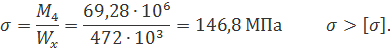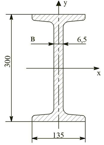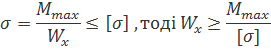 де Qmax = 57.32 кН – найбільша поперечна сила (див. епюру поперечних сил); SX – статичний момент половини перерізу; Ix – момент інерції перерізу; B – товщина вертикальної стінки.